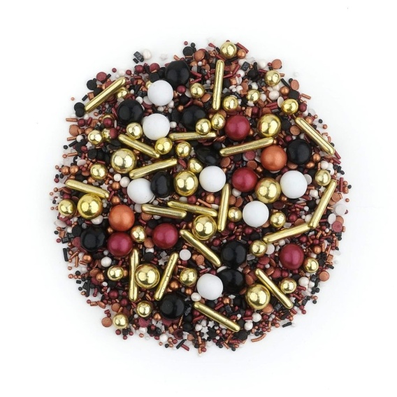 Cognac Bronze to bardzo ozdobna i luksusowa mieszanka. Kolorystyka została dobrana tak, aby nadać tej posypce tajemniczości i elegancji. Znajdziesz w niej ozdobne złote dodatki wyróżniające się na tle klasycznych, ale odważnie dobranych kolorów. Idealnie sprawdzi się jako ozdoba na specjalne okazje, np na tort na 18 urodziny.