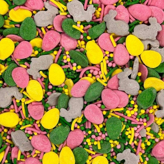 Wielkanocny mix konfetti zawiera różnorodne kształty i kolory inspirowane wiosną i świętami – pastelowe odcienie, delikatne motywy oraz drobne elementy dekoracyjne, które nadają wypiekom wyjątkowy i tematyczny charakter.