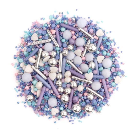 Frozen ma tę moc! Mnóstwo drobnych perełek, gwiazdeczek oraz confetti w kolorach rodem z magicznej, lodowej krainy. Całość upiększona srebrnymi pałeczkami oraz czekoladowymi kulami w rożnych rozmiarach, które dodadzą każdemu tortowi pięknego, lodowego połysku. Sprawdzi się idealnie na słodkości i tort dla małej, zimowej księżniczki.