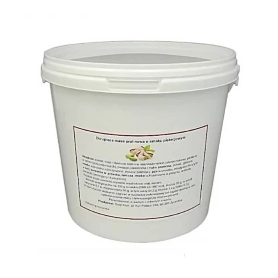 Pralina do tortu pistacjowa chrupka z herbatnikami 0,5 kg – Grejt Kejk Kremowa pralina o intensywnym smaku pistacji z dodatkiem chrupiących herbatników typu croquant. Idealna jako warstwa do tortów i deserów – gotowa do użycia.
